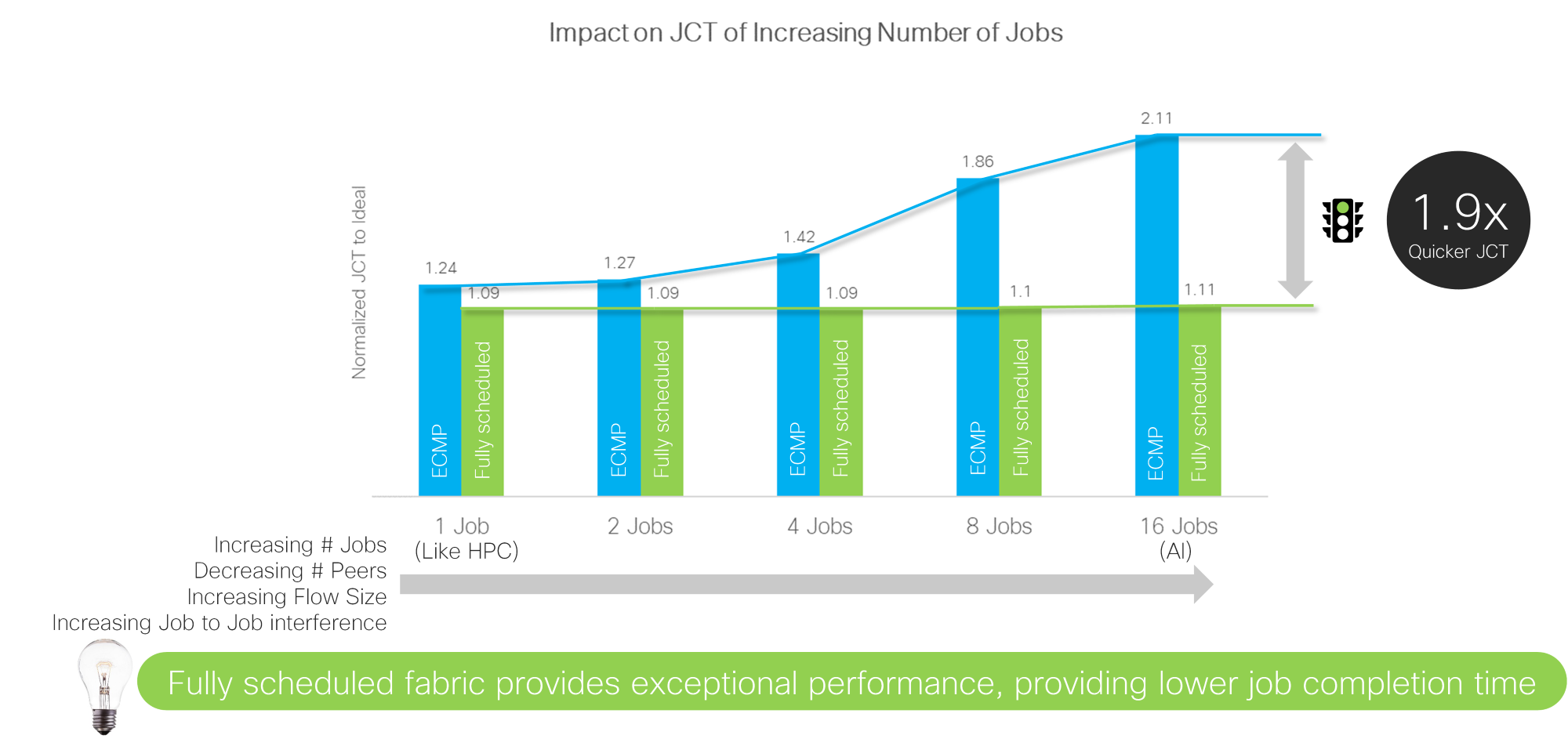 Unlike HPC, which was designed for a single job, large AI/ML training clusters are designed to run multiple simultaneous jobs, similarly to what happens in web scale data centers today. As the number of jobs increases, the effects of the load balancing scheme used in the network become more apparent. With 16 jobs running across the 256 GPUs, a Scheduled Ethernet results in a 1.9x quicker JCT.