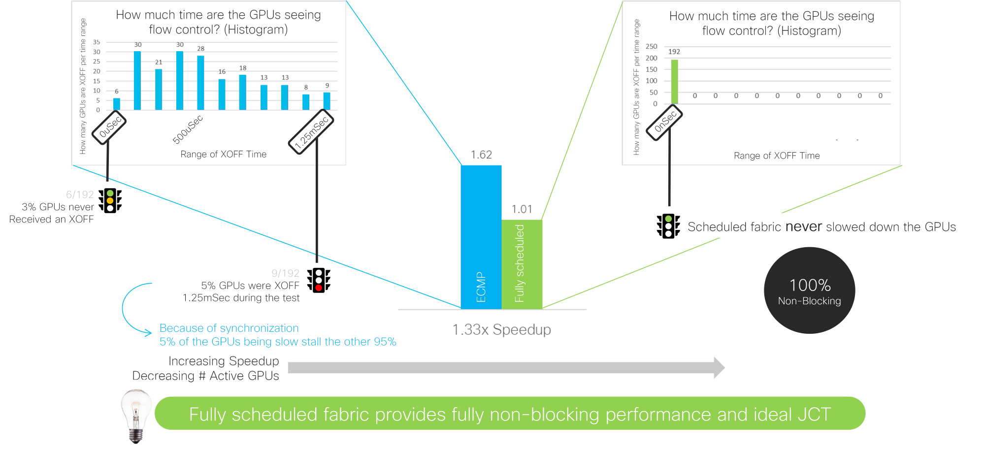 Studying the data another way, if we monitor the amount of priority flow control (PFC) sent from the network to the GPU, we see that 5% of the GPUs slow down the remaining 95% of the GPUs. In comparison, a Scheduled Ethernet provides fully non-blocking performance, and the network never pauses the GPU.