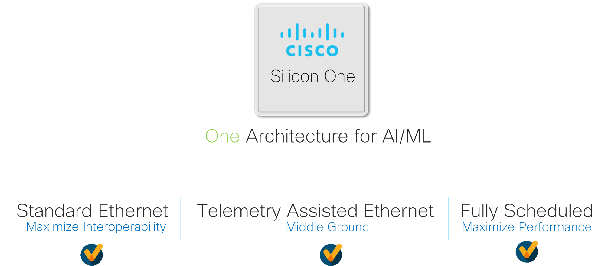 Customers can deploy Cisco Silicon One to power their AI/ML networks and configure the network to use Standard Ethernet, Enhanced Ethernet, or Scheduled Ethernet. As workloads evolve, they can continue to evolve their thinking with Cisco Silicon One’s programmable architecture.