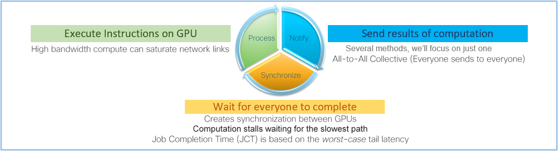The AI/ML training clusters have unique traffic patterns compared to traditional front-end networks. The GPUs can fully saturate high-bandwidth links as they send the results of their computations to their peers in a data transfer known as the all-to-all collective. At the end of this transfer, a barrier operation ensures that all GPUs are up to date. This creates a synchronization event in the network that causes GPUs to be idled, waiting for the slowest path through the network to complete. The job completion time (JCT) measures the performance of the network to ensure all paths are performing well.