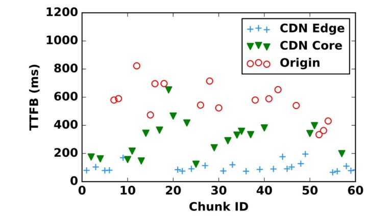 While one would expect large chunks of popular videos to be served from a closer location, and chunks of less popular videos to be served from further locations, the results showed that somewhat surprisingly, chunks within the same session may be served from different locations. Figure 3 illustrates this for an example video session from one location. Each point indicates one chunk, and the different color legends indicate where the chunk is served from (origin, or a given CDN layer). The Y-Axis indicates the time taken for the first byte of the response to be received in milliseconds (Time to First Byte or TTFB). Notice the significant variation in the first-byte latency across chunks based on the serving location. The results showed that while there is a higher tendency for chunks at the start of a session to be served from edge locations (possibly because users more frequently view earlier parts of the video), consecutive chunks are often served from different locations in both the initial and later stages of a session.