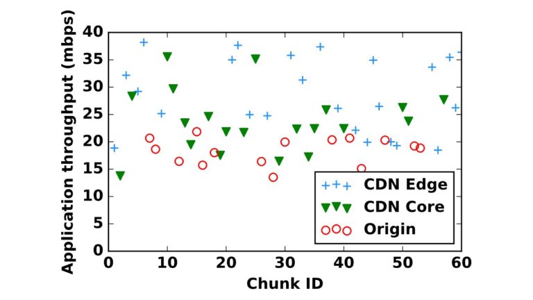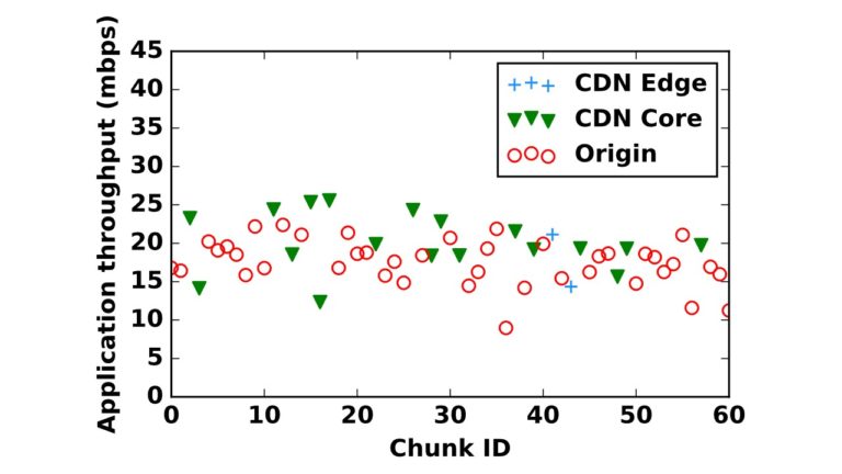 The figures above illustrate the issues for two different video sessions served from the same client location and the same CDN, but at two different times. Each figure shows where each chunk in each of the sessions is served from and shows the throughput perceived by the application for the chunk. The graph in Figure 4 shows fairly strong variations in throughput based on the serving location, while the graph in Figure 5 does not. A number of factors explain such variations in trends, including the size of the chunks, whether the throughput bottleneck is between the edge server and the client, or between the CDN edge and CDN core or origin (note that the bottleneck may vary across locations, and across time for the same location), and whether certain optimizations for large file transfer are enabled by the CDN.