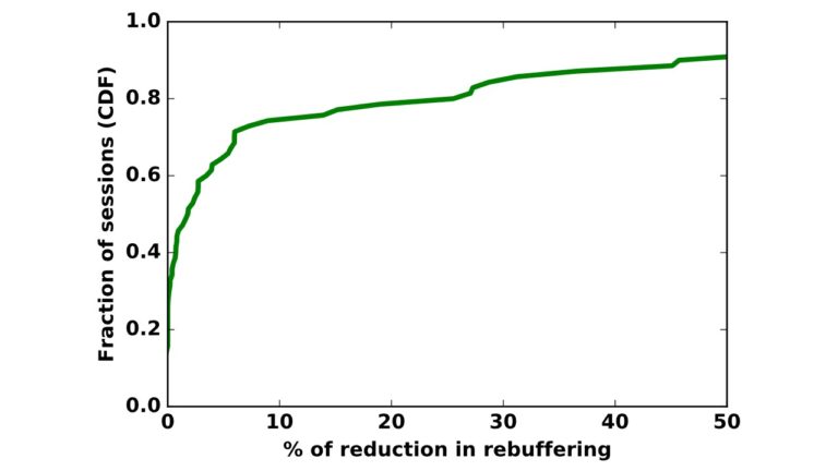 Experiments on an emulation testbed show that incorporating CDN awareness reduces prediction error for 81.7% of sessions by 17.16% on average. The figures above show the resulting benefit for video experience. Figure 6 shows that many sessions see reduced rebuffering, with a reduction of more than 25% for 20% of the sessions. Figure 7 shows that a well-accepted metric (combining multiple factors such as rebuffering experienced at the client, the bitrates selected, and the fluctuation in bitrates ) that captures video Quality of Experience (QoE) is increased by more than 10% for 20% of the sessions. Overall, these results show the potential of edge deployments to enhance the quality of experience of video streaming but also indicate that fully tapping into the benefits may require greater synergy between the client algorithm and the edge server.