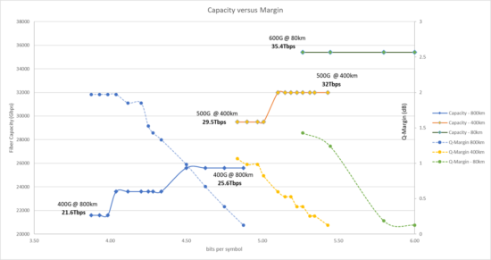 For 400G over 800km, we started with the highest baud-rate possible at 71.7Gbd/s with a corresponding modulation of 3.88 bits/symbol. This gave us a Q-margin of 2db and fit into 87.5Ghz. We then traded off the excess margin on the link for additional capacity. The optimal point as per testing was 61.72Gbs/s with a corresponding modulation of 4.5 bits/symbol and Q-margin of 1db. This signal fit into 75Ghz and resulted in a fiber capacity of 25.6Tbps. This test was similarly repeated for 500G over 400km and 600G over 80km.