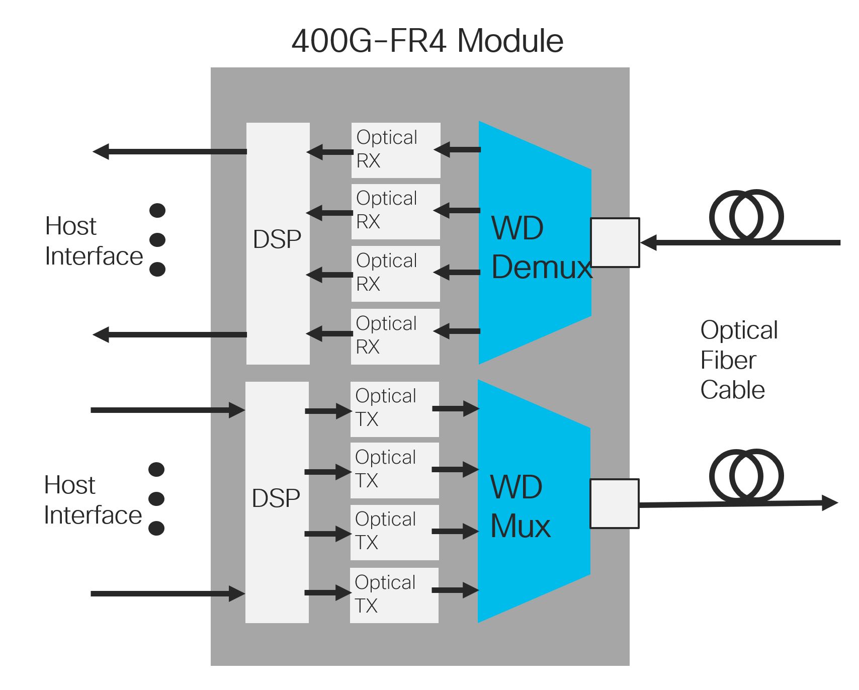 400G FR4 uses 4 different wavelengths of light on the same fiber, each carrying 100Gbps. This means 4 different wavelengths need to be combined together. This is often done using an external lens, which takes up significant volume.