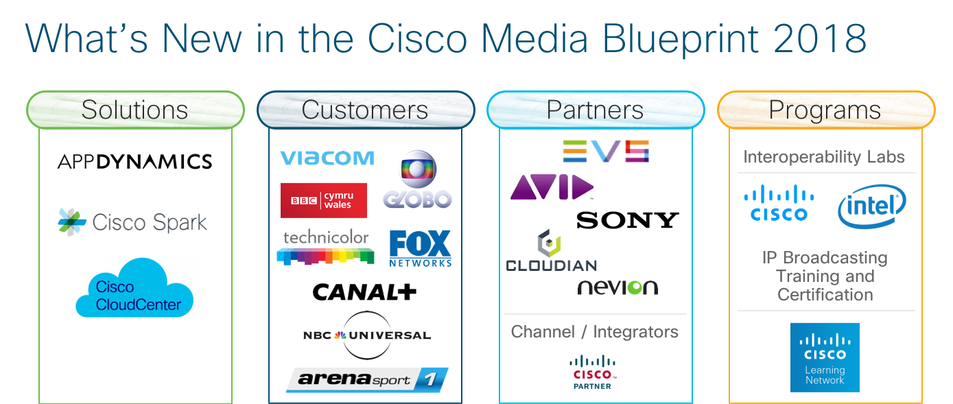 Our customers continue to realize the benefits of an open, cloud-based and IP-centric architecture to manage intense demands on their video production and distribution networks, and we are pleased to demonstrate our continued innovations in cloud and IP technology with this broad list of Cisco Media Blueprint capabilities.