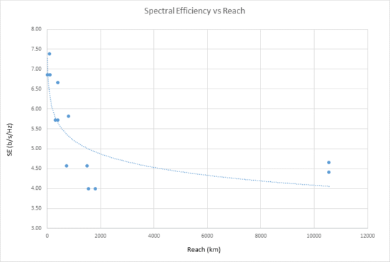 The spectral efficiency versus reach plot below summarizes data from actual field trials and lab trial testing done with the NCS 1004. Note that the variability in spectral efficiency numbers is caused by the differences in line system constraints.