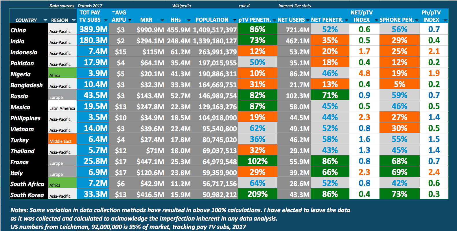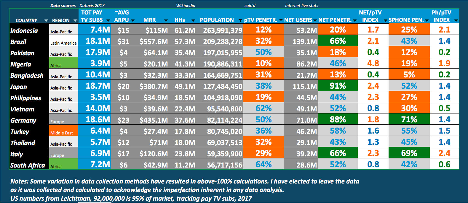 BR: Possibly, yes. That was the idea behind those “index” calculations. Take the NET/pTV Index. Countries like Nigeria for example have much higher internet penetration than pay TV penetration. So one might guess that streaming methods could be a better way to get to the next billion in those cases. Now that’s not necessarily the case, as I need to do more work to separate out satellite pay TV players since satellite infrastructure isn’t the same as fiber or cable.