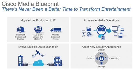 Cisco won’t enter a market if we cannot be a leader in it. Media is no different. My rockstar team is executing a clear, open, and productized strategy for this space. We call it the Media Blueprint, the foundation of which is an end-to-end ecosystem approach which is a strong challenge to point-providers who do not have that vision. And it is based on open, standards-based IP technology for production and delivery to propel our industry towards digitization ahead of legacy organizations who have not yet breached this frontier.