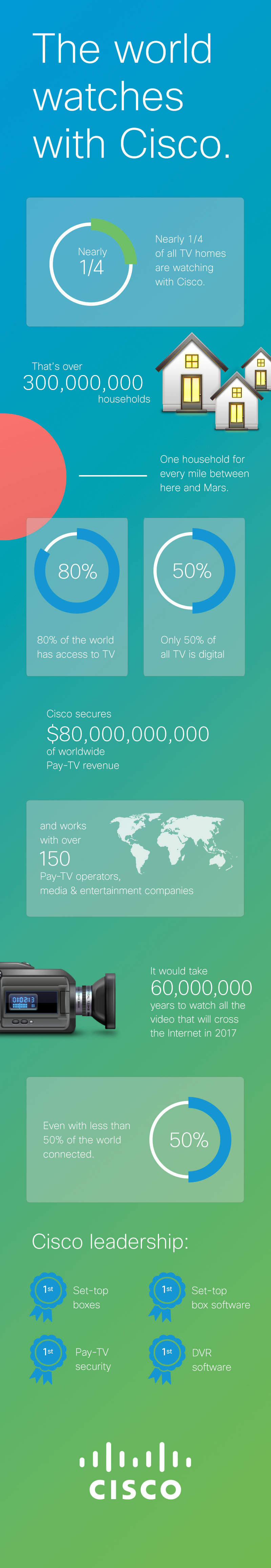 We have plenty of video milestones to share in this infographic – click here and enjoy — I just wanted to shine the light on those 300 million Cisco-powered TV households. And to thank the hundreds (if not thousands) of Cisco employees who got us here. Well done!