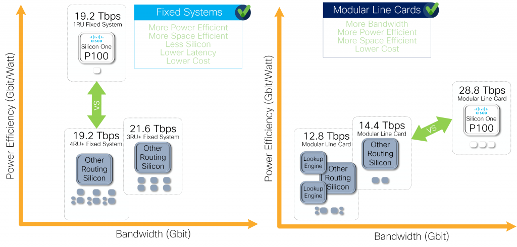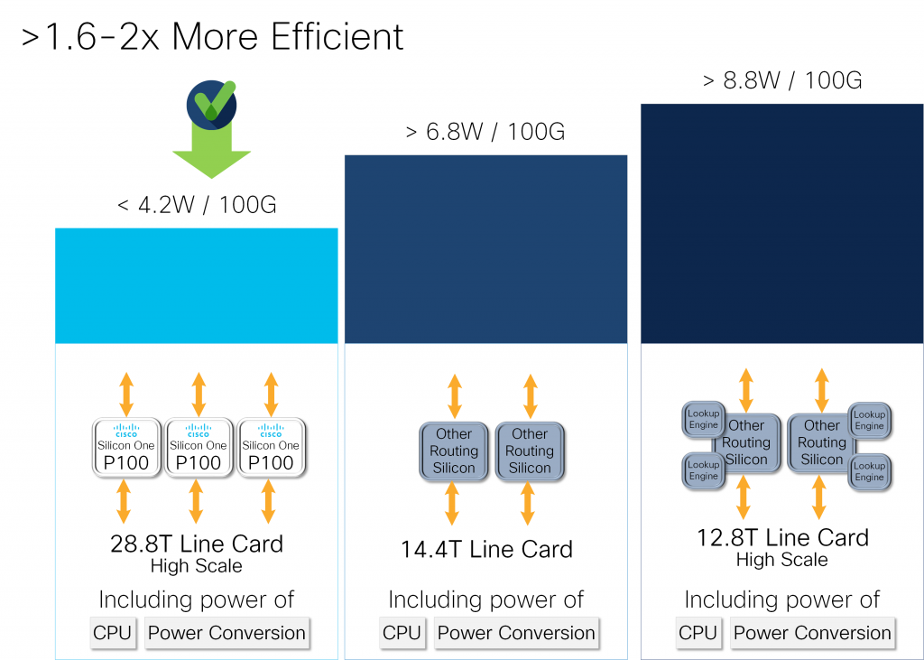 The bandwidth increase coupled with the power efficiency of Cisco Silicon One drives significant power efficiency gains compared to all other routing silicon in the market.