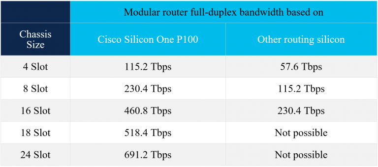 There are several types of routing silicon available on the market today from third-party silicon providers to full system vendors. This silicon covers a variety of market needs but broadly speaking routing silicon breaks down into silicon that is built for core, peering, and aggregation markets versus those focusing on broadband aggregation. If we take a look at all the silicon currently available on the market, it’s clear that Cisco Silicon One is in a class of its own, and still today there’s no routing silicon that achieves higher bandwidth, even than our original Q100 announced back in 2019. Since then, we rolled out the Q200 with higher bandwidth and lower power consumption than the Q100. Today, less than 24 months from our initial Q100 launch and just 12 months from our Q200 announcement, we released the P100, further increasing our lead over the competition. We believe the Cisco Silicon One P100 is 2.6 times higher ethernet bandwidth than other routing silicon in the market.