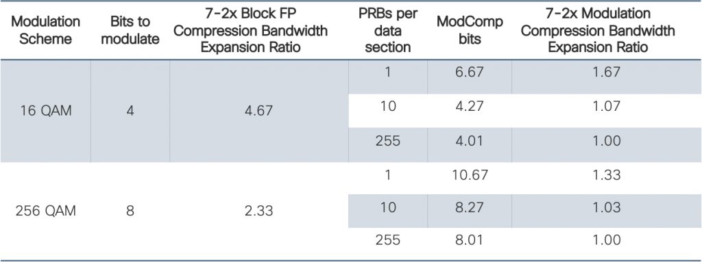 Because modulation compression requires the in-phase and quadrature points to be perfectly aligned with the constellation grid it can only be used in the downlink. However, when used, it decreases the bandwidth expansion ratio of Split 7-2x, where the expansion compared to Split 7-3 is now only due to the additional scaling and constellation shift information. This information is encoded as 4 octets and sent every data section, meaning the bandwidth expansion ratio will vary according to how many Physical Resource Blocks (PRBs) are included in each data section. This value can range from a single PRB up to 255 PRBs, with Table 3 showing the corresponding Split 7-2x bandwidth expansion ratio over Split 7-3 is effectively unity when operating using large data sections.