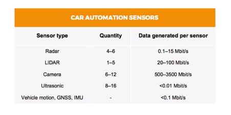 As the Intel slide presented at the beginning of this blog series identified, the various sensors that manufacturers install within the vehicle will generate a considerable volume of information. The exact number of each sensor type can lead to a wide variation in the amount of data generated.