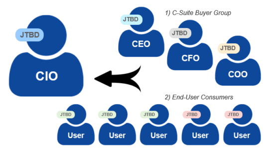 Figure 1:  How JTBDs are “rolled up” to the CIO for communications solutions from 1) C-suite buyer groups and 2) end-user consumers