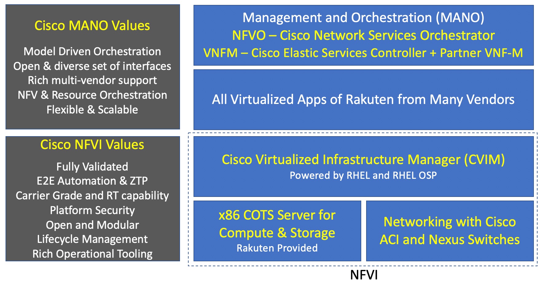 On the technical side, while Rakuten will start its journey with LTE-Advanced technology in the radio access, they have adopted a 5G-based systems architecture for their network from day one. Virtualization and cloud native are key tenets of the 5G Systems architecture and are at the center of Rakuten’s technical strategy. They are deploying a network that is fully virtualized from RAN to Core, while leveraging mobile edge computing with end-to-end automation for both network and services. On the Radio Access Network (RAN) evolution front, this is an incredible accomplishment for the team involved and an excellent example, at scale, of what is possible with Open vRAN. Rakuten’s press release emphasizes the pivotal role of their common and distributed telco cloud platform used to host all virtualized applications. Rakuten has coined their “common and distributed telco cloud” as RCP, short for Rakuten Cloud Platform, which first appeared in a seminal LinkedIn post from Tareq Amin, the CTO of Rakuten. Cisco Systems has played a critical role from the very beginning of this exciting journey alongside Rakuten, and we could not be more proud of our partnership and collaboration. Under the hood, the RCP is powered by Cisco’s NFVI and Orchestration technologies. The purpose of this blog post is to share additional details on RCP’s design principles, architecture and technologies involved.