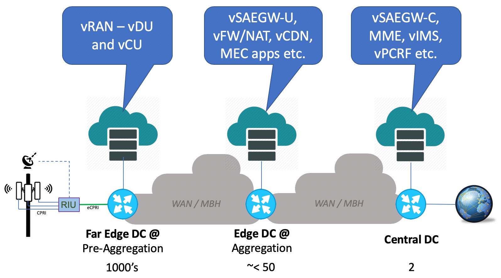 - Centralized Data Centers – there will be 2 in the network, and they will host key applications like vSAEGW-C, vMME, vIMS, vPCRF, vHSS, vOSS, vBSS, virtualized Gi services as well as MANO functions etc.