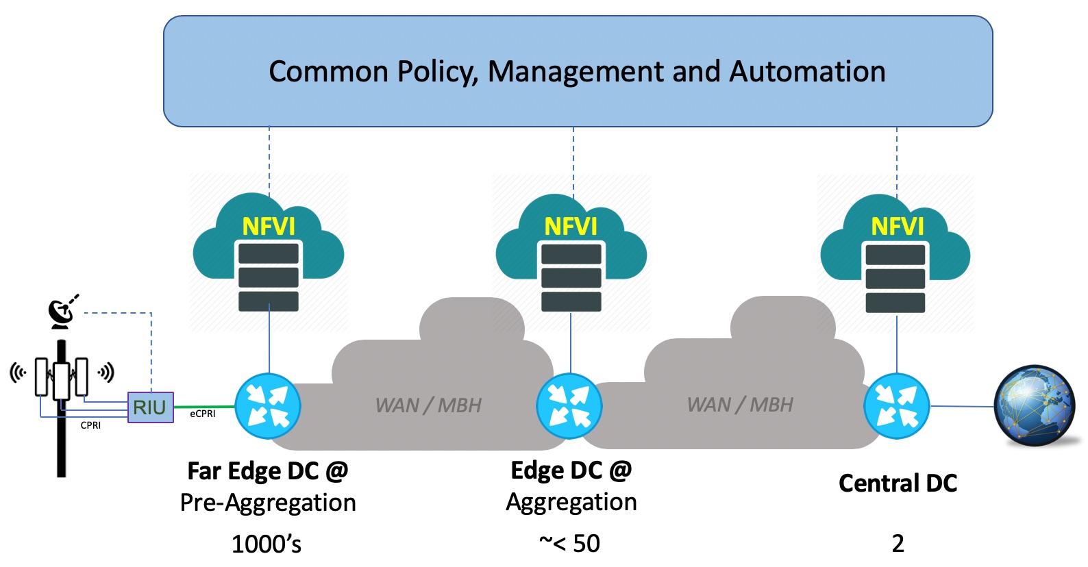 - Eventual Centralization of Management Tools – NFVI PODs today have localized software management tools to drive lifecycle management through software and hardware maintenance. Our plan is to eventually centralize those management functions as a service and eliminate the associated overhead from the Far Edge DC locations.