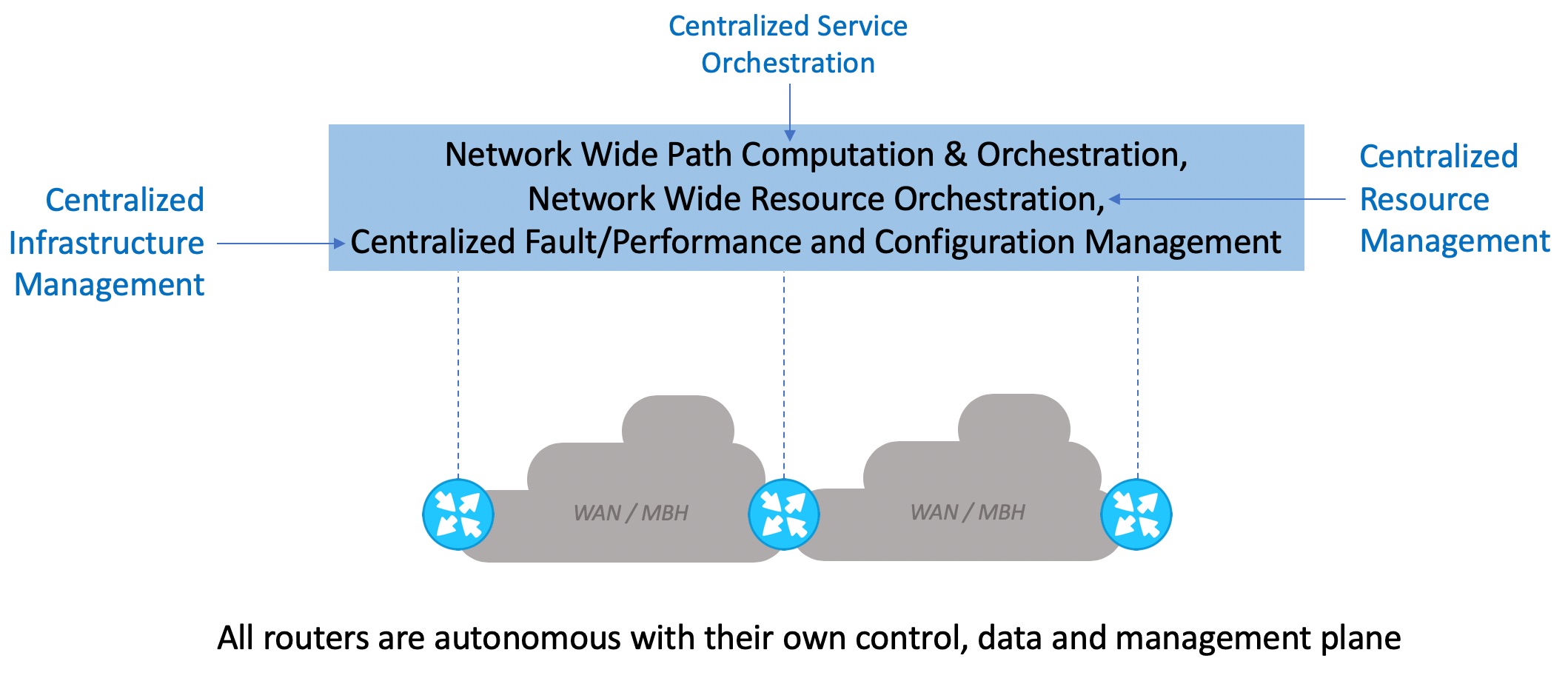 These key design principles ensured that each of the Far Edge DC NFVI PODs were fully autonomous with their own control plane (including their own API end-points), data plane and management plane – all done at a bare minimal footprint that has almost no overhead, yet address our goals around reliability and predictability while achieving a lower cost point. This model bears similarities with the way large scale IP networks have been built over the years, and how the IP Networking for Service Providers has evolved with Software Defined Networking (SDN). Take a look at the figure 4 below that shows an IP Network with routers at different locations. Each of those routers are fully autonomous with its own control plane, data plane and management plane, that ensures predictable and reliable operation. But with centralized management and now with SDN, we have centralized features that augment the IP network with capabilities like service orchestration (e.g. global traffic engineering), global resource management and distributed infrastructure management.