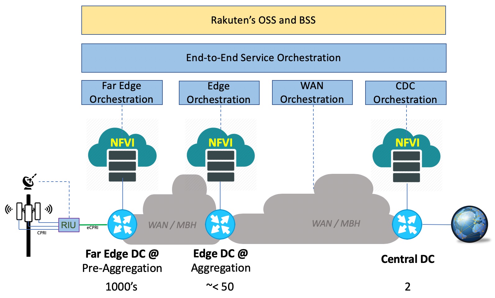- Edge Data Centers at Regions/Aggregation locations – there will be somewhere around 50 or slightly less. They will host key applications like SAEGW-U, vFW/NAT, vCDN and will serve as the mobile edge computing hub for Rakuten.