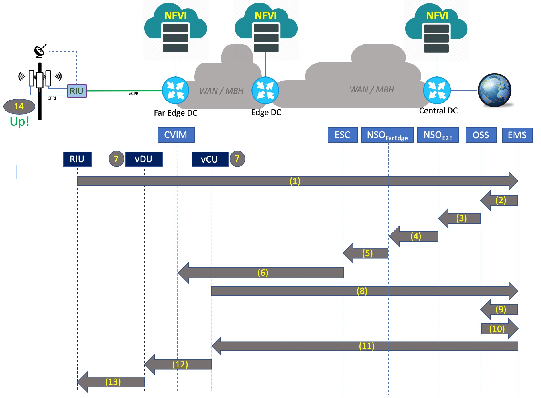 Step 1 – RIU at Cell site upon booting up sends up notification to the vRAN EMS