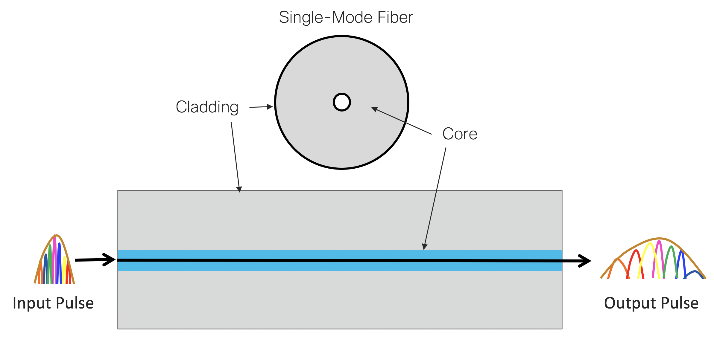 Optical data signals are comprised of very short bursts of light, or optical pulses. When we transmit optical pulses through fiber, they broaden. This means that they become longer in duration as they travel through the fiber. If the fiber is long enough, this broadening causes the pulses to overlap and interfere with each other, which impacts the receiver’s ability to resolve the transmitted data, resulting in bit errors. This pulse broadening is due to a phenomenon called dispersion and limits the transmission bandwidth and distance. Single-mode and multi-mode fiber are each dominated by different types of dispersion.
