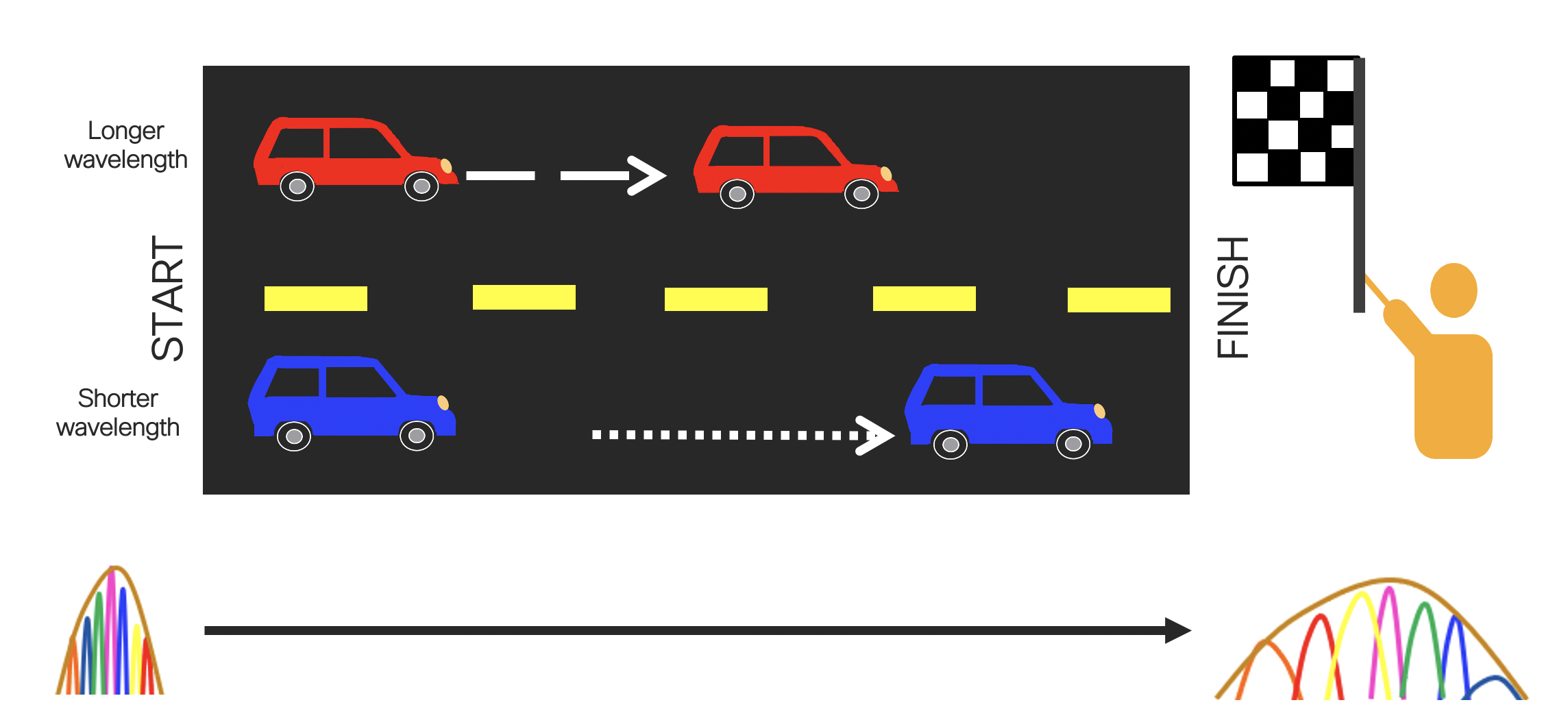 An analogy would be that of a car race where the blue car arrives the finish line faster than the red car. Here, the blue wavelength travels faster than the red wavelength.