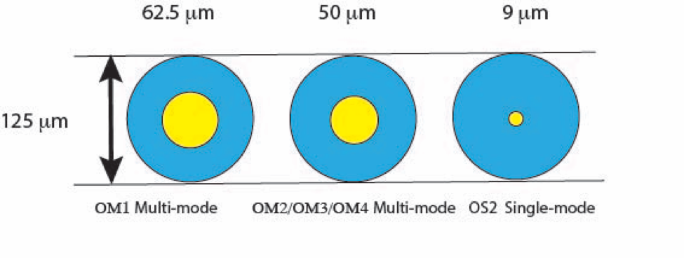 As described in our previous post, optical fiber has the structure of a core surrounded by cladding. The core and cladding are both glass with different indices of refraction. The core of single-mode fiber is much smaller than that of multi-mode but the cladding diameters of both are the same.
