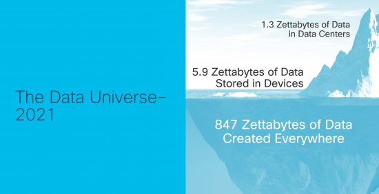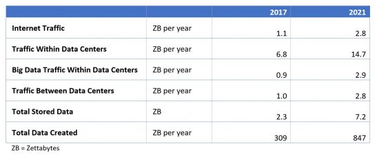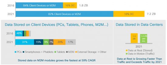 The total amount of data stored in data centers and on users devices will reach 7.2 Zettabytes by 2021, several times higher than the 2.8 Zettabytes of annual Internet traffic. The majority of this stored data resides on end-user devices – PCs, smartphones, tablets, and (increasingly) IoT or M2M devices. More of this data is moving to the cloud over time, with data stored within data centers growing from 16 percent in 2016 to 18 percent in 2021. But there is still a lot of data stored on edge devices, and there appears to be a need to blur the boundaries of the data center in order to allow the intelligence associated with data center big data to encompass even “bigger” data – the data outside the data center.
