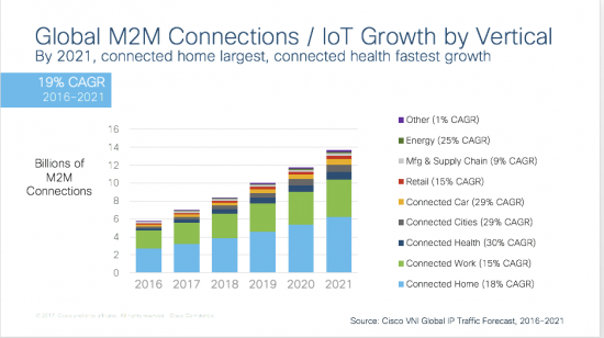 The latest Cisco VNI Complete Forecast update forecasts that for the first time in its 12-year history, there will be more M2M connections than end-user devices such as smartphones, laptops, TV sets, etc. By 2021, there will be 13.7 billion machine-to-machine (M2M) connections globally, accounting for 51% of the total IP connected devices and connections. This represents an average of 1.75 M2M connections per capita globally – demonstrating how pervasive M2M connections are going to become to our networked lives making Internet of Things (IoT) a reality.