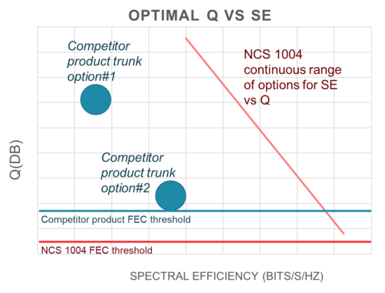 Figure 2: The below figure plots Q versus Spectral Efficiency for the NCS 1004 and for a typical competitor product. The NCS 1004 provides a continuous range of spectral efficiency values for different Q. Competitor products offer fixed line rates that limit the ability to maximize spectral efficiency for the desired Q-margin.