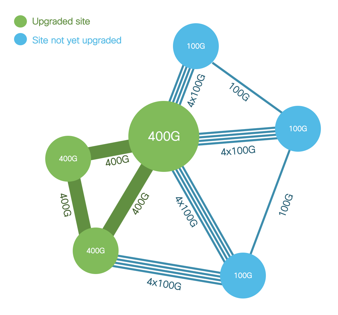 At any given time, you could have a mix of new 400G sites and legacy 100G sites, still operating and connected to each other. The example in the figure below shows the various connections between different pairs of sites.