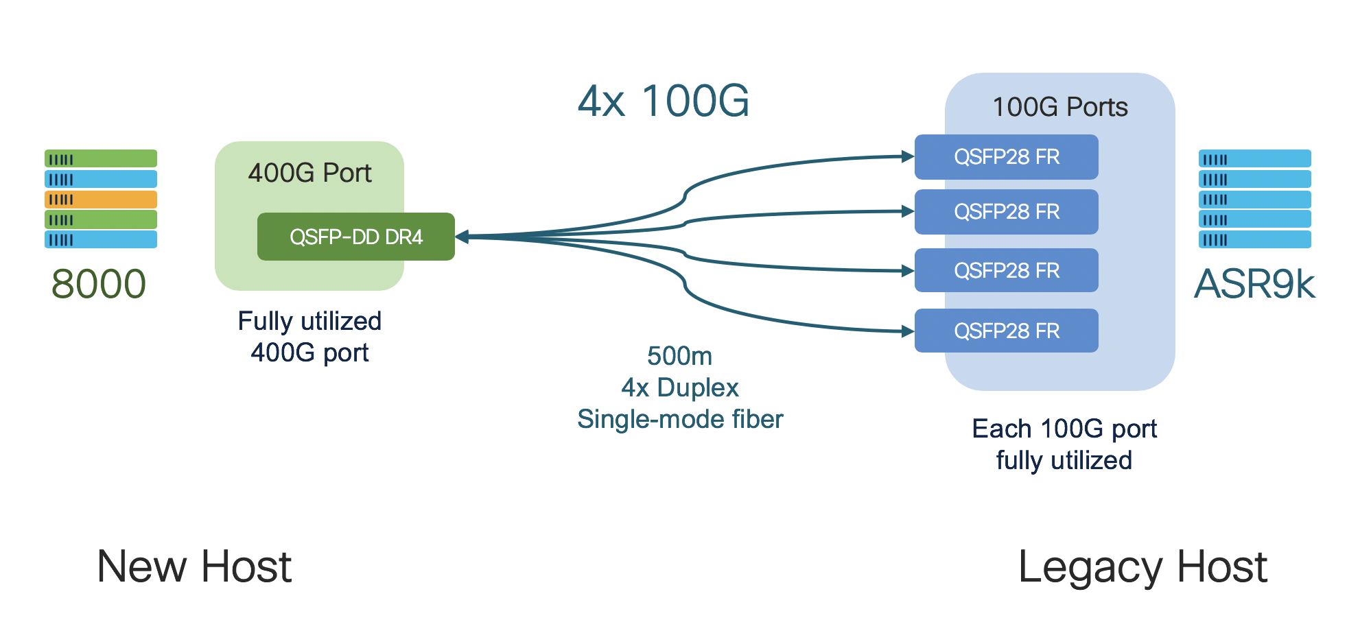 Let’s say you had ASR9k routers with 100G ports at two nodes of your network (see figure below). In one node (on the left), you could replace it with the 8000 Series router with 400G QSFP-DD ports, and then connect it back to the 100G ports in the ASR9k at the other end (on the right). You would use 400G QSFP-DD DR4 modules in breakout mode, and connect each DR4 to four individual 100G QSFP28 FR modules with the help of a fiber breakout cable or cartridge.