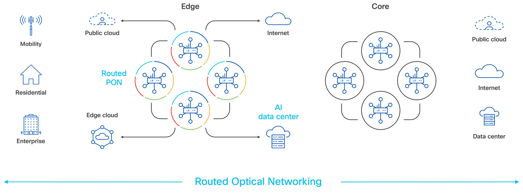 As shown in Figure 1, Cisco Routed Optical Networking and Routed PON, part of the Agile Services Networking architecture, bring localized processing and other services closer to the edge. This architecture is further enhanced by AI-powered automation and assurance, which ensures optimal traffic management, fault detection, and dynamic resource allocation.
