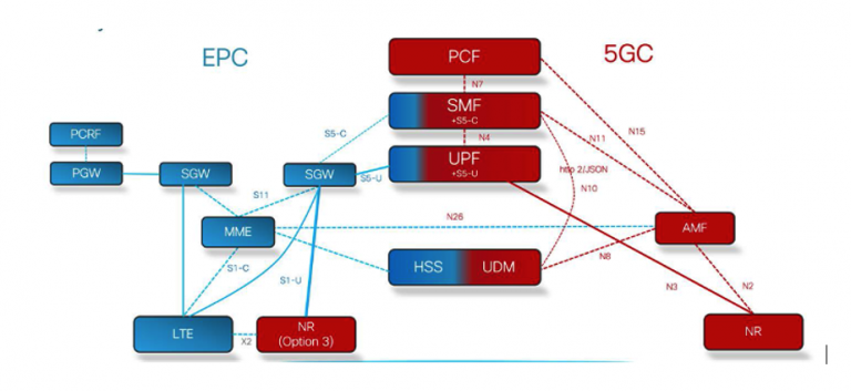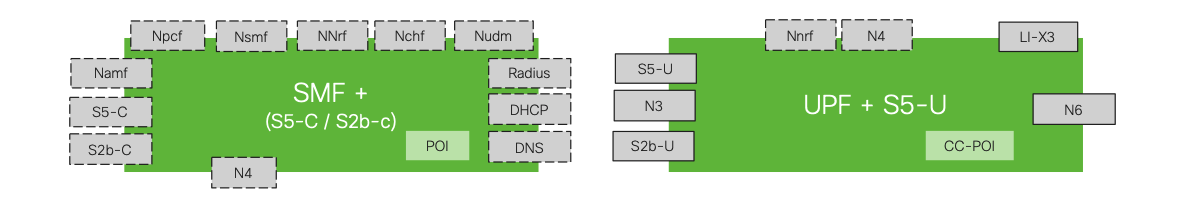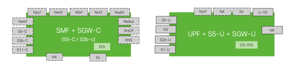 - Session Management Function (SMF) + Serving Gateway Control Plane Function (SGW-C) and the User Plane Function (UPF) + Serving Gateway User Plane Function (SGW-U) as a complete converged core
