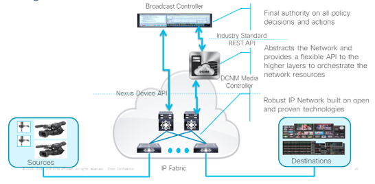 Here’s a real-world workflow example: video traffic from a stadium is being sent back to a media data center for processing. The traffic passes through a service provider link which is not controlled by the broadcast engineer. With Media Flow insights, the broadcaster gets real-time reporting on the video flows prior to reaching the service provider network and also as the flow arrives at the media data center. The DCNM media controller correlates the reported state and localize if video errors were triggered at the stadium, at the SP transit network, or inside the media data center.