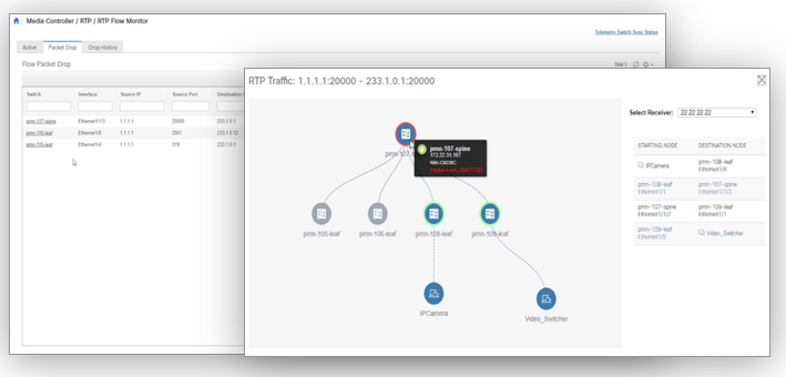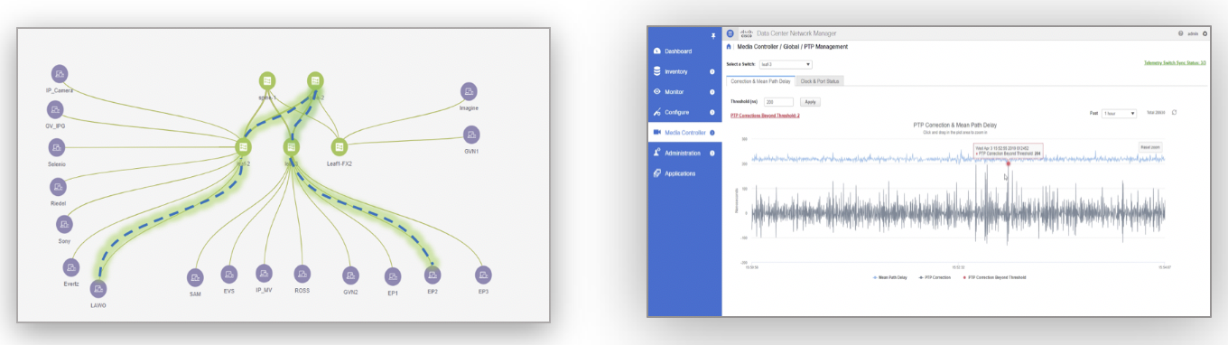 Let’s dig a little deeper into how software telemetry is used for multicast visualization. In SMPTE ST2110, packets are carried using multicast, so knowing how to troubleshoot multicast is critical for broadcast engineers. Multicast troubleshooting using switch Command Line Interfaces (CLIs) is challenging even for the most experienced administrators. Our DCNM media controller utilizes the telemetry information from switches to provide a Graphic User Interface (GUI) to visualize and trace multicast flows across the fabric in real time. These visual tools allow broadcast engineers to triage the problem by examining traffic flow and packet loss, which equals less down time. Figure 1 offers examples of visualization for multicast and PTP monitoring.