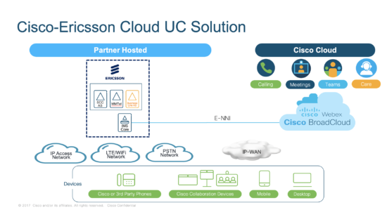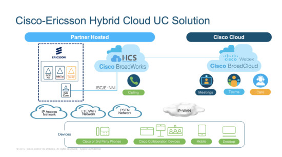 The UC solution provided by Cisco can be deployed fully within the Cisco cloud (Option 1 – Cisco-Ericsson Cloud UC Solution), or a combination where calling is implemented within the SPs cloud and collaboration capabilities hosted by Cisco, or fully hosted by the service provider. (Option 2 – Cisco-Ericsson Hybrid Cloud UC Solution)