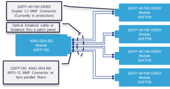 With the arrival of 400GE applications, customers will finally have no choice but to start using MMF transceivers that require more than duplex fiber. 400GE ports can be used to aggregate traffic from 100GE ports, still leveraging the duplex MMF from 100GE BiDi modules to 400GE modules in a breakout configuration as shown in the diagram below.