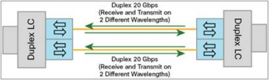 BiDi technology transmits and receives optical signals over a single fiber. In most BiDi applications, the wavelengths of the signals are different. The designs leverage the difference in wavelength to reduce cross talk between the Tx and Rx. In the case of duplex transceivers such as Cisco’s QSFP-40G-SR-BD, each fiber is both transmitting and receiving data as shown in the diagram below.