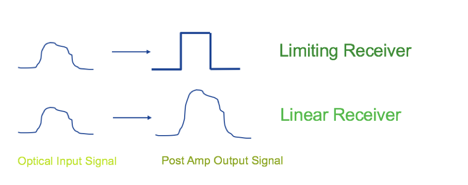 The output of a linear receiver remains proportional to the power of the received optical signal. In a limiting receiver there is an additional limiting amplifier stage and a comparator to boost the variable amplitude of the preceding amplification stage to a constant limited amplitude. The limiting receiver output is either high or low and “limited” by the voltage output of the comparator.