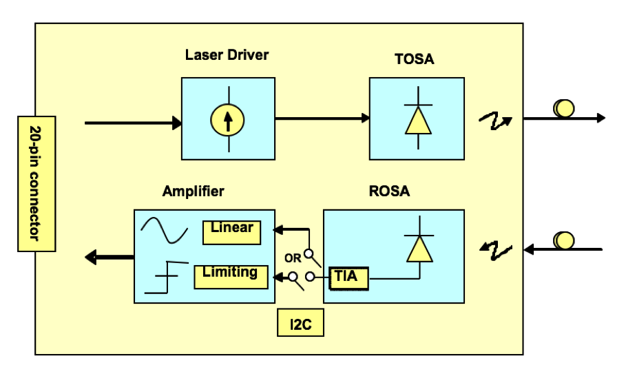 The heart of most 10G optical transceivers are the transmitter and receiver optical sub-assemblies (TOSA and ROSA). The ROSA is composed of a photodiode that converts the optical signal to photocurrent and the transimpedance amplifier (TIA) that converts the photocurrent to voltage, creating the useable electronic signal. There are two possible flavors of the receiver. Depending on the SFP+ architecture, either a limiting or linear electrical interface will be implemented in the module.
