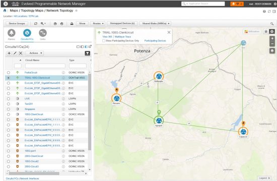 After the network setup is complete, you can use the integrated service assurance app to verify circuits are performing according to their SLA. For example, you want to examine an optical circuit connecting one central office to another. With one click, you can visualize the circuit and see the end-to-end connection, including any other COs that the circuit may flow through. The dashboard view provides all the stats you need to verify that the circuit is performing optimally, including forward error correction, optical power level, error in bytes (delivering), jitter, and latency. If there is a problem on a circuit, the app’s logical view shows you exactly what’s impacted including the intermediate ports and line cards. You see exactly where the problem exists and you can clearly associate the hardware fault to the circuit and do an impact analysis to see what customers are impacted.