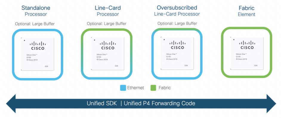 Another important innovation of the Cisco Silicon One Q100 is its unprecedented versatility. Up until now, networking vendors were using different and specific silicon chipsets for standalone processors, line card processors, and fabric elements.