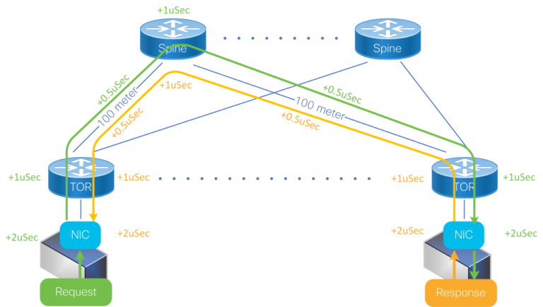 To help understand the round-trip times associated with a network, let’s look at a simple example. The RTT is a function of the network physical span, the delay of intermediate switches, and end nodes delay (that is the network adapters and the software stack). Light travels through fiber at about 5us per kilometer, so the contribution of the physical span is easy to calculate. For example, communication between two hosts in a datacenter with a total fiber span of 500 meters per direction will contribute 5us to the RTT. The delay through switches is composed of pipeline (minimum) delay and buffering delay.