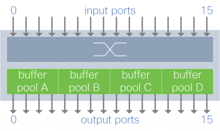 A group of output ports shares a buffer pool. Each buffer pool absorbs traffic destined to a subset of the output ports.