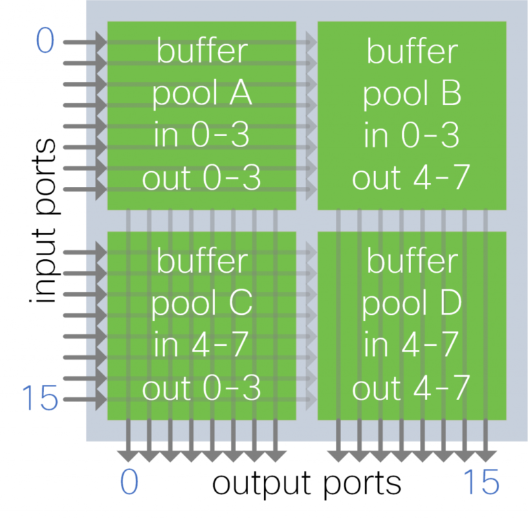 A group of input ports share a buffer pool. Each buffer pool absorbs traffic from a subset of the input ports.