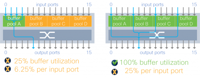 With input buffer sharing, burst absorption depends on the traffic pattern. For example, in a 4:1 oversubscription traffic pattern with the buffer partitioned to four pools, the burst absorption capacity is anywhere between 25-100 percent of total memory.
