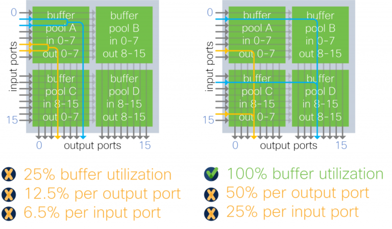 Oversubscription is an unpredictable transient condition that impacts different ports at different times. An efficient buffer architecture takes advantage of this by allowing the buffer to be dynamically shared between ports.
