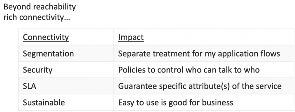 Rich connectivity means the network is responsive to the user or application experience and does so in a frictionless manner. It means network overlays can subscribe to underlay services and exert granular control over how their traffic traverses the network. Rich connectivity means applications can dynamically consume low latency or lossless network services, or access security services to enable a zero-trust relationship with other elements they may need to interact with.